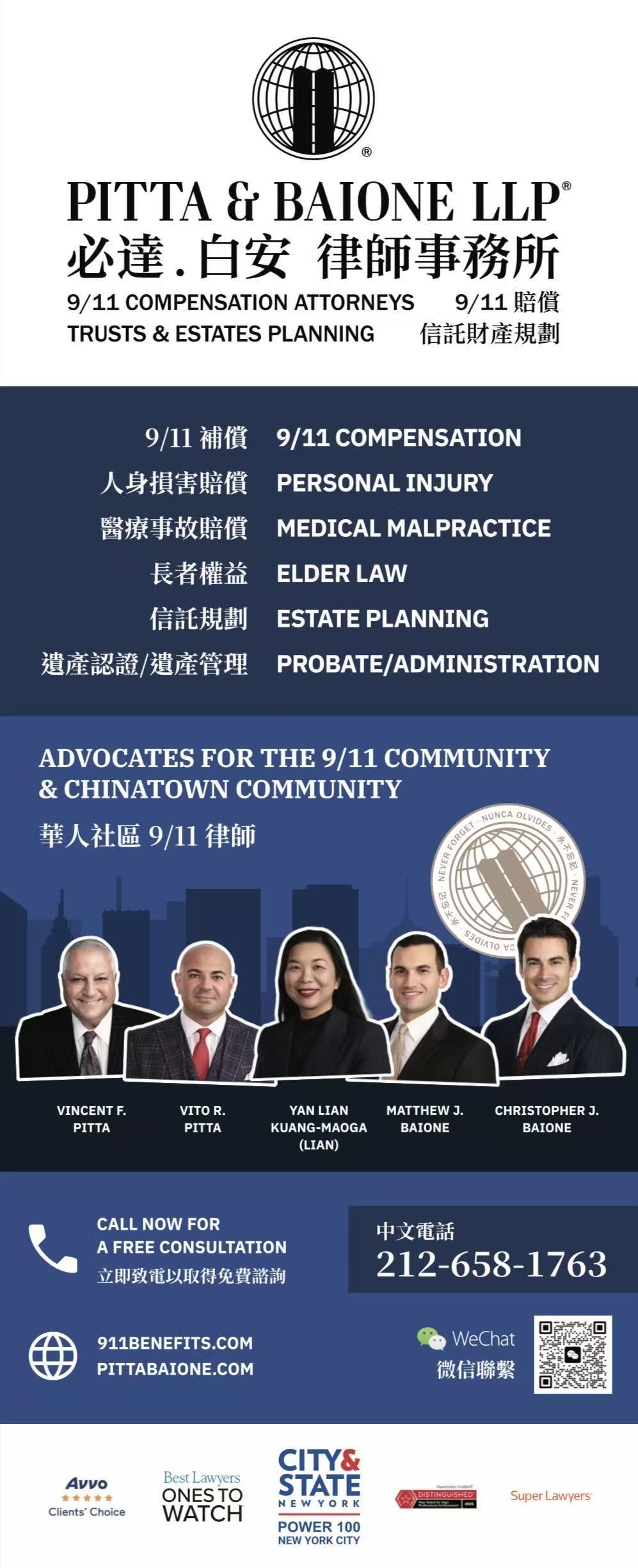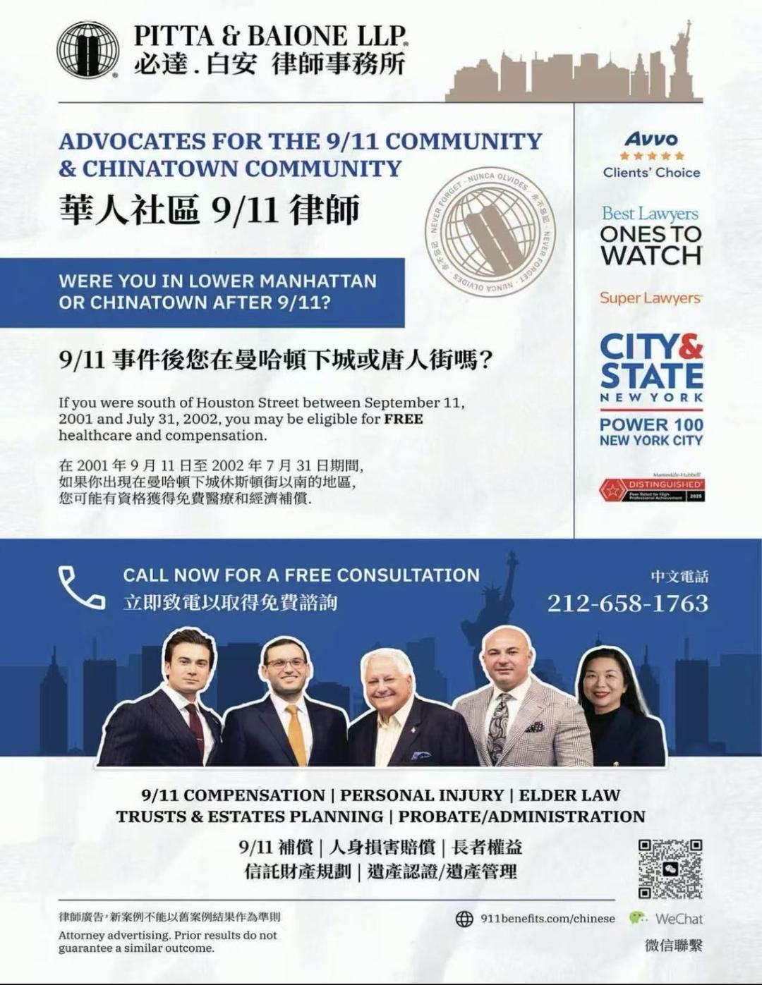 2001年9月11日袭击世贸中心、五角大楼和宾夕法尼亚州坠机现场的事件引发有毒空气污染扩散,曼哈顿下城被雾霾覆盖,整个唐人街的民众都呼吸了有毒的空气,导致在灾区内生活的群众患上癌症和其他疾病,然而世界贸易中心 (WTC) 健康计划和 9 月 11 日受害者赔偿基金(VCF)能给予幸存者一点点帮助。申请获批9/11受害者补偿基金需要律师更有条理整理申请人的文书工作,该补偿基金要求登记注册后才能在申请流程开始时交出能够获取批准所需的所有必要文件。专门从事9/11疾病索赔的律师 必达.白安 律师事务所 帮助在2001年9月11日至2002年5月30日期间暴露在9/11毒素环境里的民众免费登记注册,以保障所有幸存者可能需要提交申请补偿金的权利。而已确认患有相关9/11疾病的幸存者可以通过律师提交申请获得免税的经济补偿,已经离世的幸存者的亲人也可能可以获得相应的遗产补偿金。可能担心语言不通和其他政府福利的华人社区民众也有权申请补偿金。该律所来自华人社区,有专门从事政府福利的华人律师邝艳莲大律师主理长者法务和信托财产规划,可以直接与申请人沟通并解答相关问题。