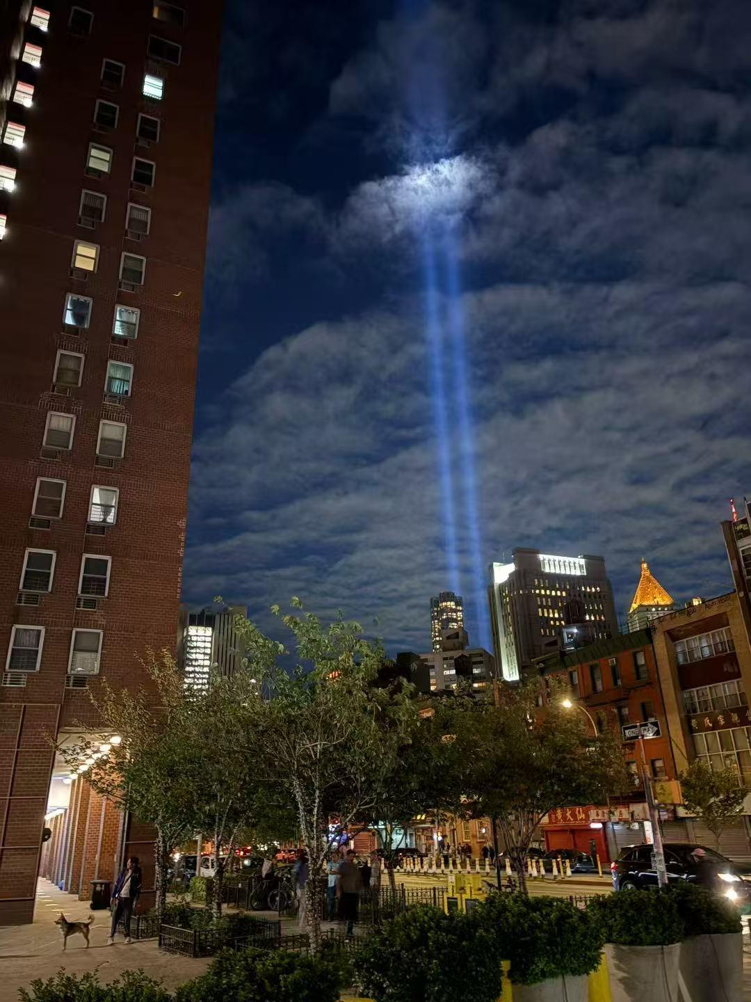 今年9月11日的早晨天清气爽,与2001年9月11日的天气相似。24年前的那一天,被劫持的两架客机撞向纽约世贸中心双子塔,24年后,遇难者亲属聚集在世贸中心遗址纪念园。一年一度的传统911纪念之光日前已经以两束蓝色灯光照亮曼哈顿的天际线,从黄昏到黎明,纽约市60哩半径范围内都可以看到。纽约唐人街靠近世贸中心,纪念之光显得格外耀眼。9/11事件已经过去24年,但华人社区仍然有民众陆续确诊9/11癌症。