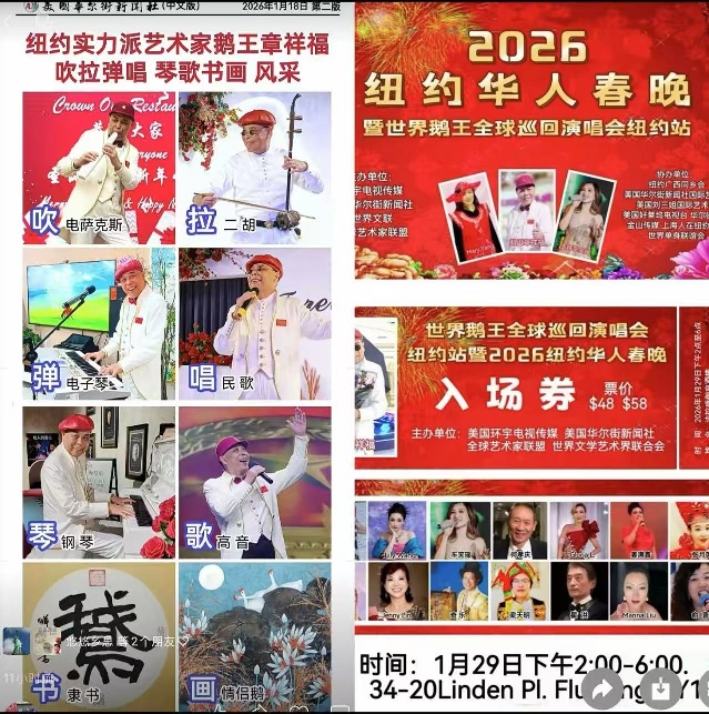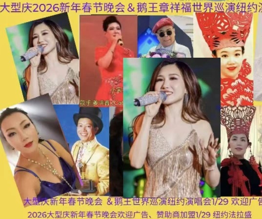 艺坛名家鹅王演唱会&纽约华人春晚/寒雪过见暖阳 春晚日彩云归 2026纽约华人春节联欢晚会在法拉盛"御庭酒楼"即将盛大开幕