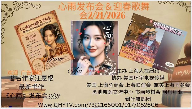 心中有情 雨里飘香 / 美籍著名 作家汪惠根《心雨》新书发布会&大型 迎春歌舞联欢会2/21 纽约 新闻, 社区新聞ghytv2026-02-04心中有情 雨里飘香 记者、编辑《上海人在纽约》: 当我写下 《 心雨》 的最后一个字时,纽约的阳光正趴在法拉盛…