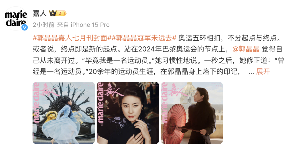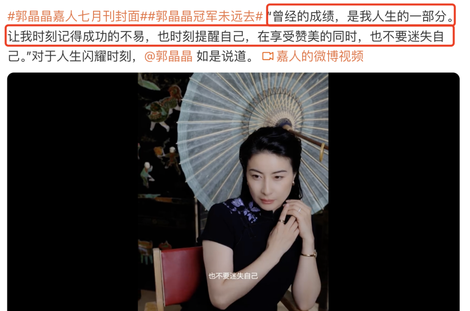 郭晶晶在此次采访中说:曾经的成绩是我人生的一部分,让我时刻记得成功的不易,也时刻提醒自己,在享受赞美的同时,也不要迷失自己。