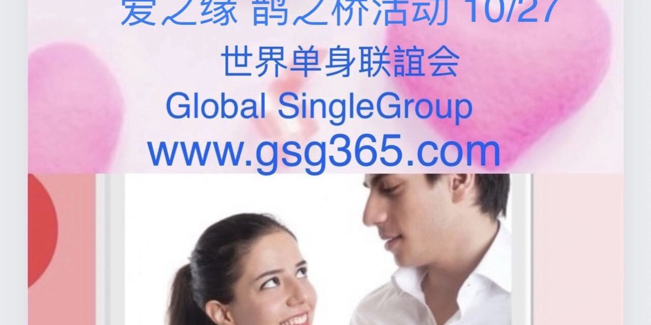 世界单身 婚戀交友活動 ( Global Single Group Activity ) . 10/27. 每月底定期活动 http://Video link https://youtu.be/RCS0yCyHOuE詳細聯絡7323316189/9177052606. 世界单身聯谊會Global Single Group 注冊 www.gsg365.com 办公: 3370 prince street Flushing NY 11354.