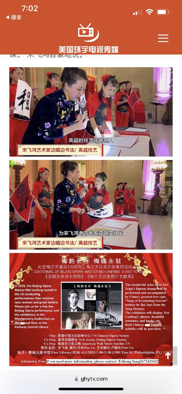 宋飞鸿老师纽约演唱会 9/7-著名京剧表演艺术家一宋飞鸿老师 娱乐, 广告商讯, 教育频道, 文娱频道, 新闻, 社会, 社区新聞ghytv2024-08-16本台讯 著名京剧表演艺术家一宋飞鸿老师纽约演唱会 9/7 致敬梅兰芳大师,传承国粹精神,宋飞鸿 免费公益演唱会…