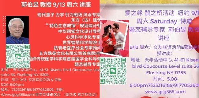 现代量子风水 引力风水 磁场风水 中国堪舆星相学家心灵科学净化专家 婚恋辅导专家.郭伯昱教授讲座& 交友活动 9/13周六