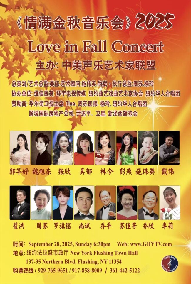 中美声乐艺术家联盟主办大型《情满金秋音乐会》9/28/2025 纽约市政厅隆重举行. 乡音乡情拉满情怀,中西经…