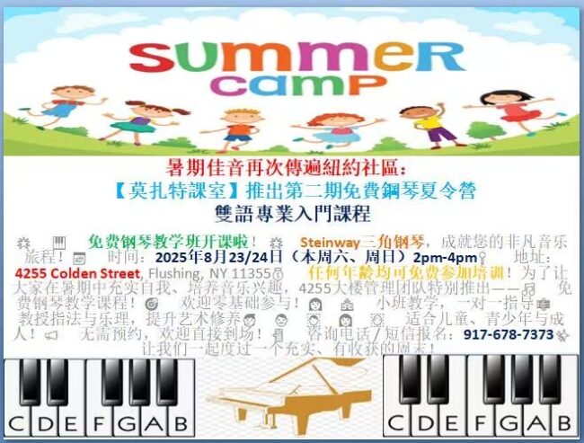 纽约莫扎特课室 推出第三期免费钢琴夏令营8/23-8/24