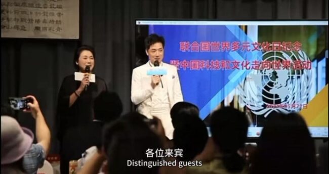 联合国官方活动国际主持人王国权和上海电视台新闻主播冯冰主持联合国世界文化多样性促进对话和发展日花絮  …