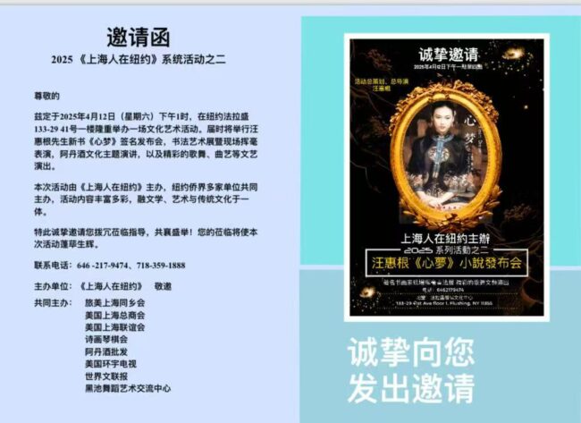 《心梦》著名作家 汪惠根老师 新书发布会 4/12 纽约启扬文化活动中心 娱乐, 广告商讯, 教育频道, 文娱频道, 新闻, 活動信息, 社会, 社区新聞ghytv2025-03-26《心梦》著名作家 汪惠根老师 新书发布会 4/12 纽约启扬文化活动中心 快訊:記者報導:四月十二日的下午,阳…